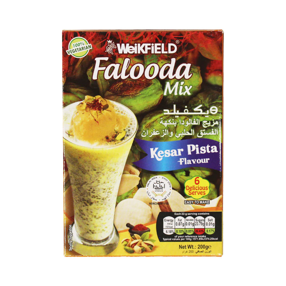 Ingredients: Cane Sugar (Cane Sugar, Preservative: Sulphur dioxide), Dextrose, Vermicelli (Wheat Flour, Water), Maize Starch (Maize Starch, Preservative: Sulphur dioxide), Raisins (Raisins, Preservative: Sulphur dioxide), Basil seeds, Colour: pistachio green , Carmoisine, Pistachio Flavour.