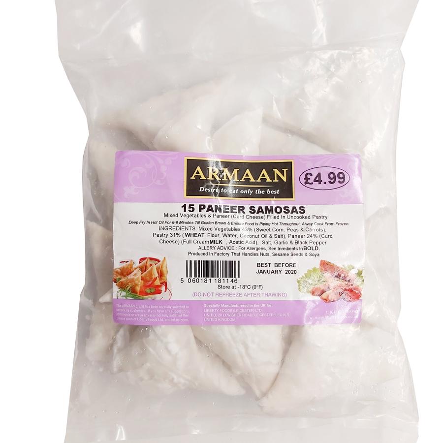 Armaan Frozen Paneer Samosas 15pc is backordered and will ship as soon as it is back in stock.
