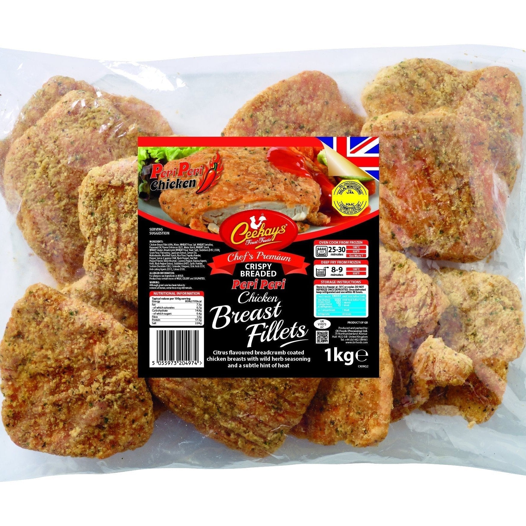 Chicken Breast Fillet (56%), Water, WHEAT Flour, Salt, WHEAT Semolina, Rapeseed Oil, Flavour Enhancer: E621, Maize Starch, WHEAT Starch, WHEAT Gluten, Breadcrumb (WHEAT Flour, Yeast, Salt), Stabilisers (E451, E500), Gram Flour, Flavouring, Capsicum Extract, Lemon Oil, Maltodextrin, Modified Starch, Rice Flour, Paprika Powder, Pepper, Spices (Cayenne Chilli, Black Pepper), Red Bell Pepper Powder, EGG Albumen, Cayenne Pepper, Raising Agents, Herb, Black Pepper Extract, Stabilisers (E407), Garlic Powder, Sodium Diacetate :E262, Coriander, Oregano, Citric Acid: E330, Anti-caking Agent: (E551), Colour: E100.